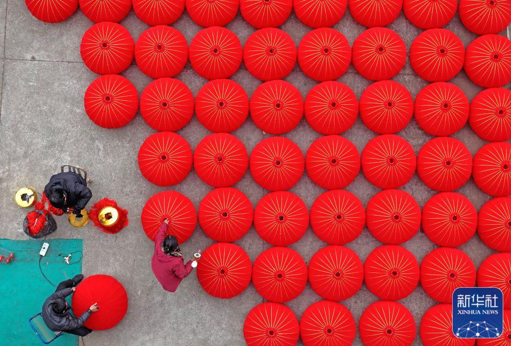 ↑ 1月21日,在浙江省台州市仙居县横溪镇一家灯笼加工作坊,工人赶制大红灯笼(无人机照片)。新华社发(王华斌摄)