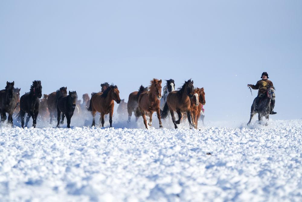 1月3日,新疆昭苏县湿地公园的“天马踏雪”表演。新华社记者 徐宏岩 摄