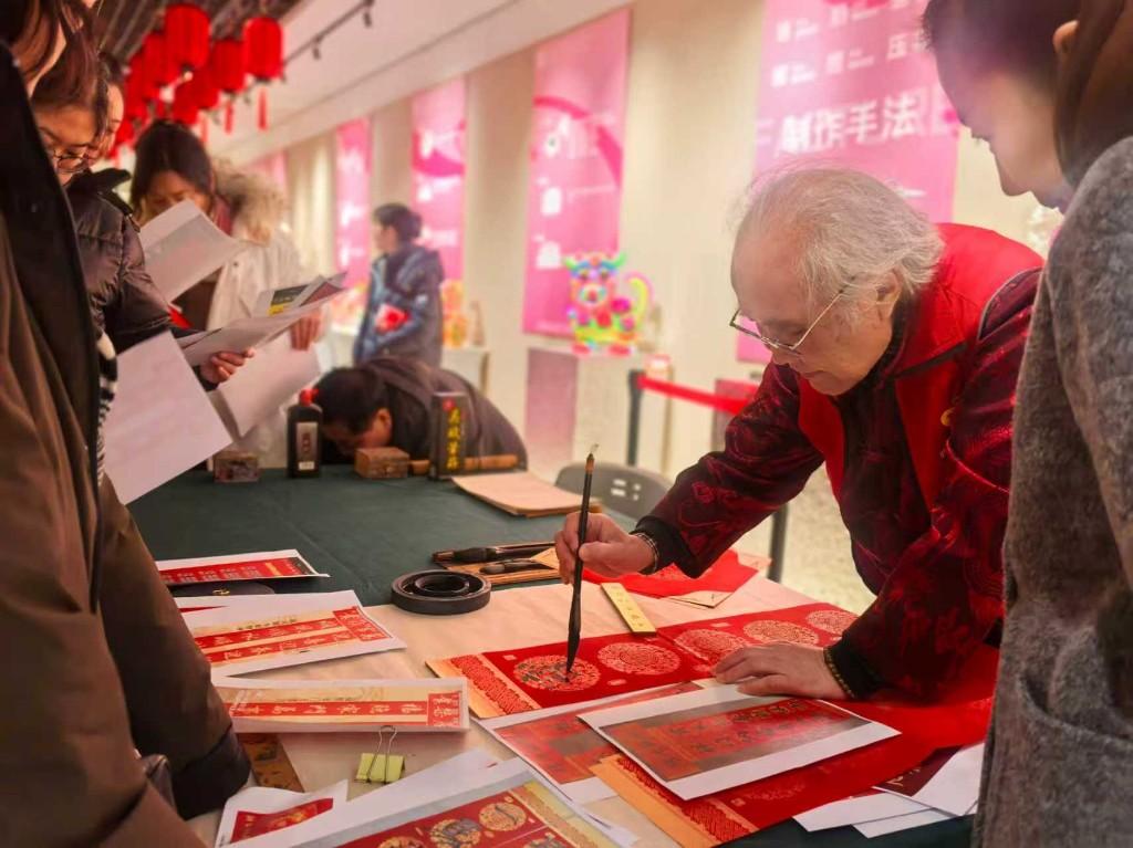 活动现场,非遗代表性传承人铺展红毡、饱蘸浓墨,一边书写春联、“福”字,一边讲述字体的由来及特色,洋溢着墨香与文化交织的暖意,吸引了众多市民驻足观赏、争相求取。其中,一幅创意“马”字作品格外吸睛。这幅字以浓黑墨色立骨,笔力遒劲奔放,既保留了书法的写意韵味,又将骏马的灵动姿态融入笔画之间。“这是我从篆书‘马’字中化来的,又稍加艺术加工,特别是这个‘马尾巴’,让马儿一下子活了起来。”葫芦烙画传承人梁平安笑着说。