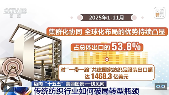 2025年1—11月,我国纺织行业规模以上企业工业增加值同比增长1.7%,限额以上服装、鞋帽、针纺织品类商品零售额超1.3万亿元,同比增长3.5%;对 “一带一路”共建国家纺织品服装出口额达1468.3亿美元,占总体出口的53.8%,集群化协同、全球化布局的优势持续凸显。