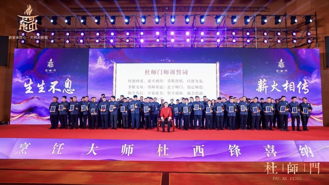在陕西省烹饪餐饮行业协会第七届第二次理事会期间,举行了杜西锋大师收徒仪式。本次仪式共新收省内外弟子105名,现场气氛庄重、环节严谨,在沿袭传统礼仪的基础上融入了新的表现形式。弟子依次向师父鞠躬、敬茶、恭呈拜师帖,杜西锋大师接纳弟子并宣读《杜师门收徒训词》,向弟子提出“敬天惜食”“守正创新”“崇德尚艺”三条门训,勉励他们恪守厨德、精进技艺、传承匠心。
