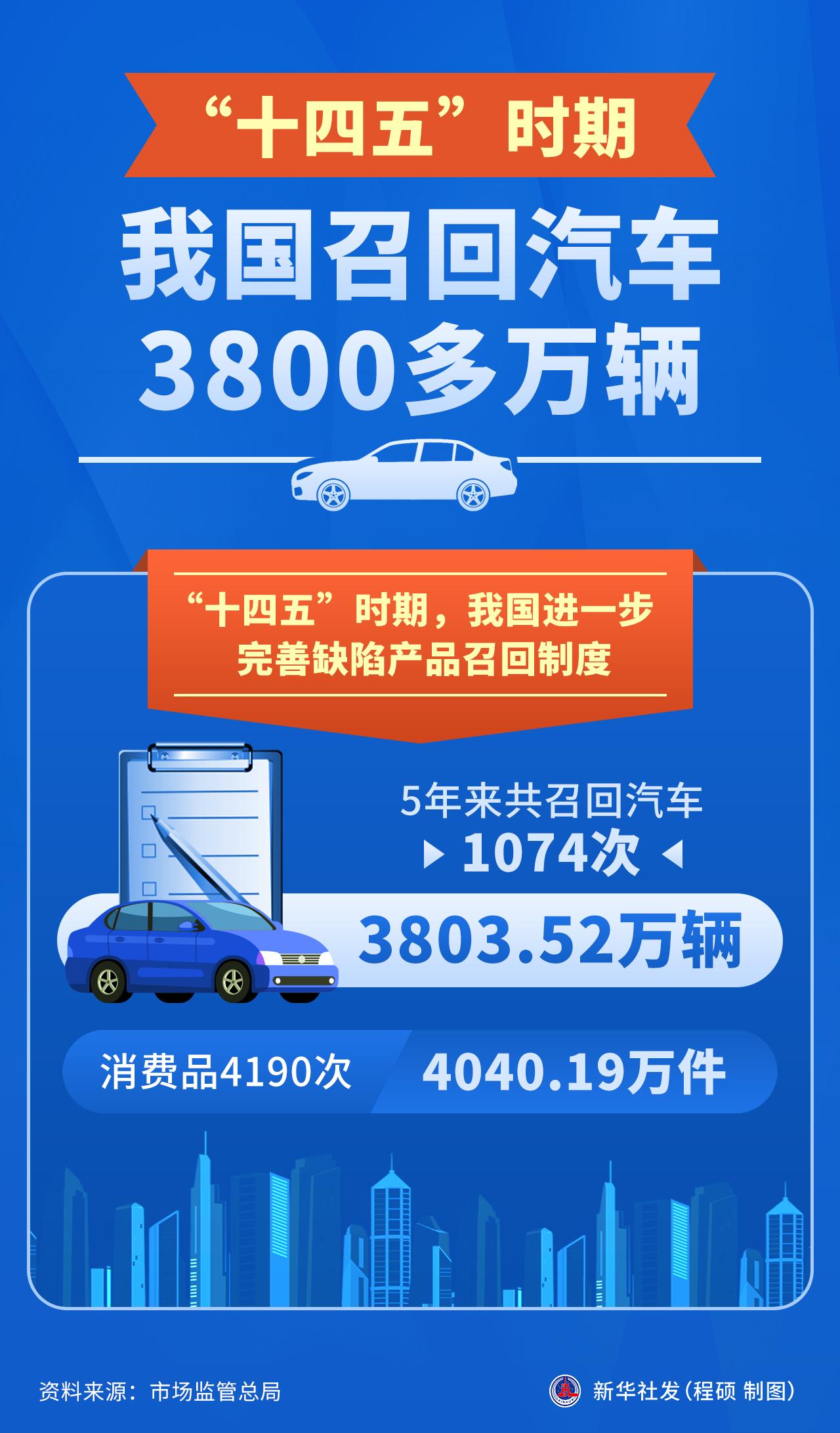 记者29日从市场监管总局获悉,“十四五”时期,我国进一步完善缺陷产品召回制度,5年来共召回汽车1074次、3803.52万辆,消费品4190次、4040.19万件。