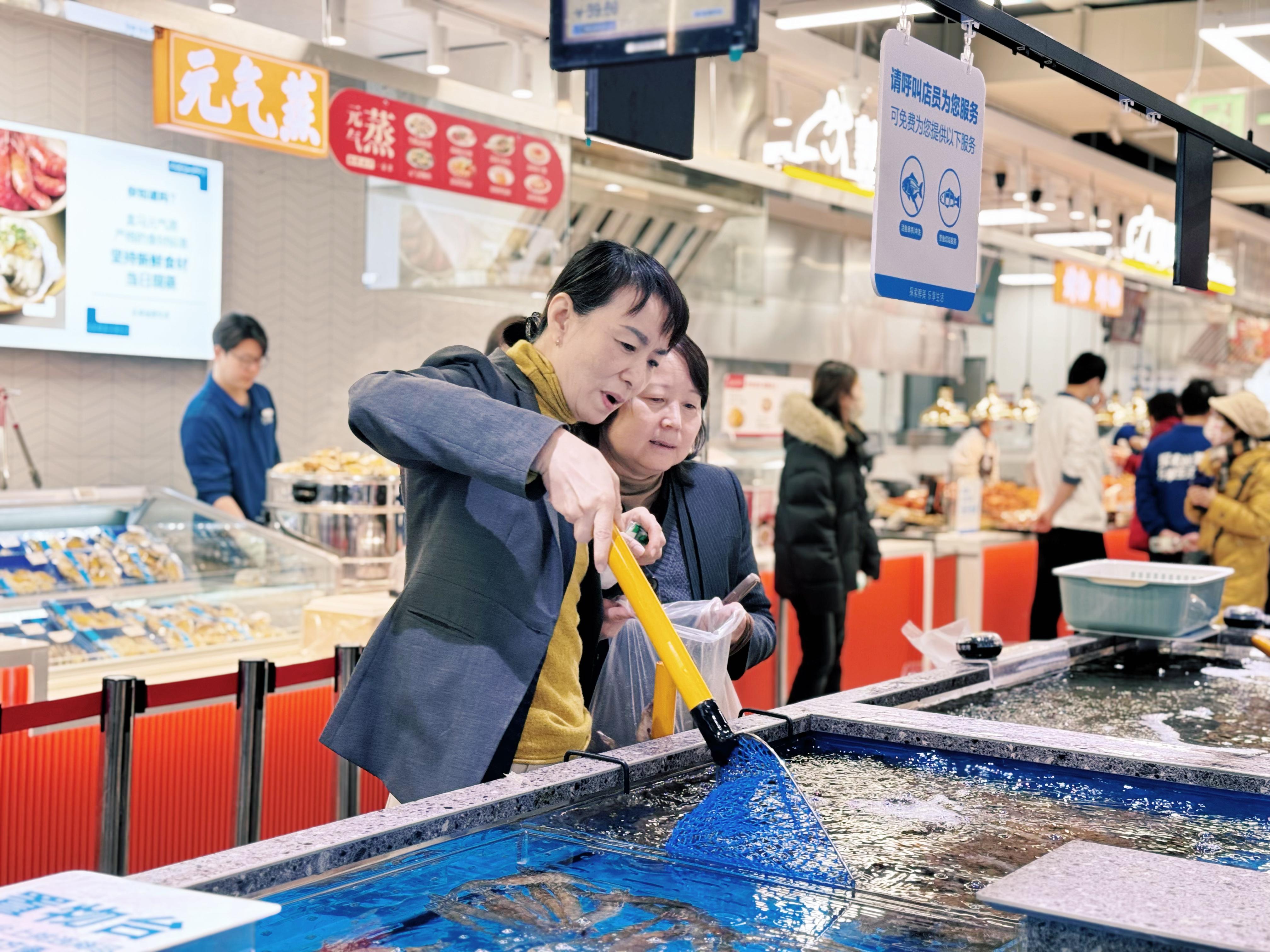 盒马万象天地店店长陈建国介绍,新店围绕用户的“逛吃体验”,增加现蒸、现烤、现卤的餐饮档口,现烤的牛羊肉串,现卤的腊牛肉,还有现蒸的生蚝扇贝,希望通过烟火气吸引更多顾客来门店体验。