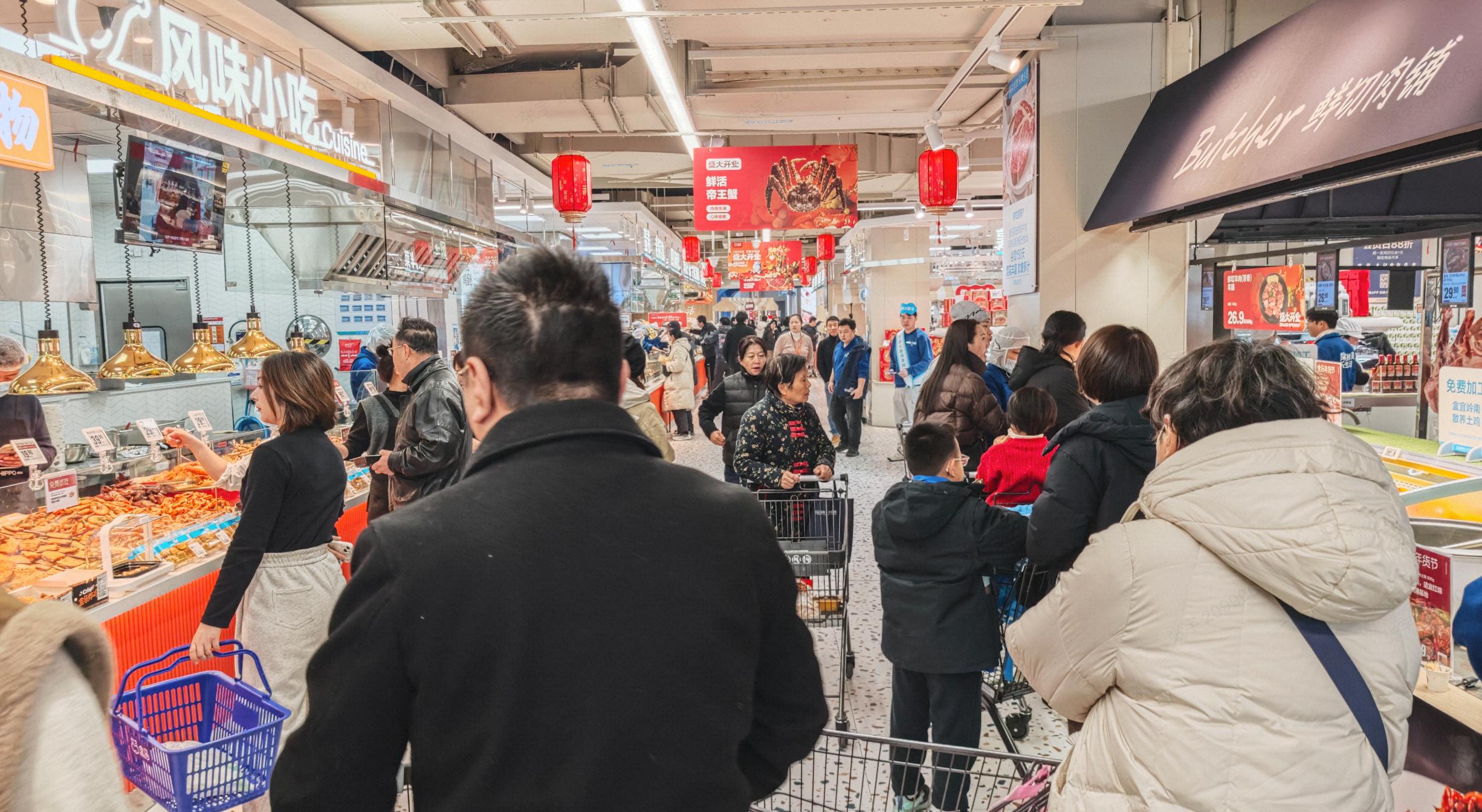 与其他门店区别的是,这里的层高更开阔、灯光明亮、货架之间的间距更宽敞。岁末年关,店内也是挤满选购年货的市民,陕西特色蒸碗、特色年菜、年货礼盒被迅速抢购。