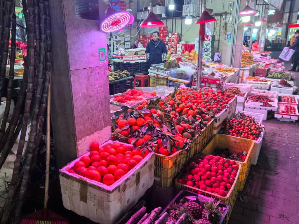 记者在南宁市琅西夜市附近一些售卖柑橘、石榴、菠萝蜜等水果的摊位看见,在“生鲜灯”照射下,水果更显红艳。