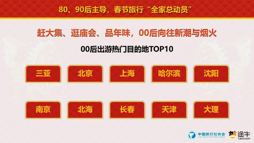 00后则热衷于打卡新潮的网红景区和追求更具烟火气息的年俗体验。三亚、北京、上海、哈尔滨、沈阳、南京、北海、长春、天津、大理等是截至目前00后预订的热门目的地。除主题乐园、传统文化、冰雪旅游等热门玩法外,今年春节假期,00后对赶大集、逛庙会、品年味等传统年俗活动展现出了浓厚兴趣。