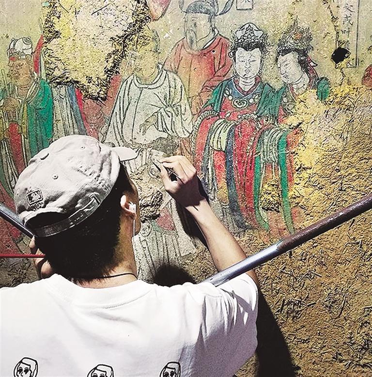 重层壁画修复可谓步步惊心。修复师先收集清代壁画碎片编号登记,再以毫米级精度剔除上层地仗层,“粘连紧密处,一人一天最多剔除10厘米见方,这不到100平方米的墙面,十余人工作了近4个月才全部剔除完毕。”张江源记得,修复师或坐或站重复细微动作,延时摄影一上午画面几乎无变化,他们宛如“面壁修行者” 坚守初心。