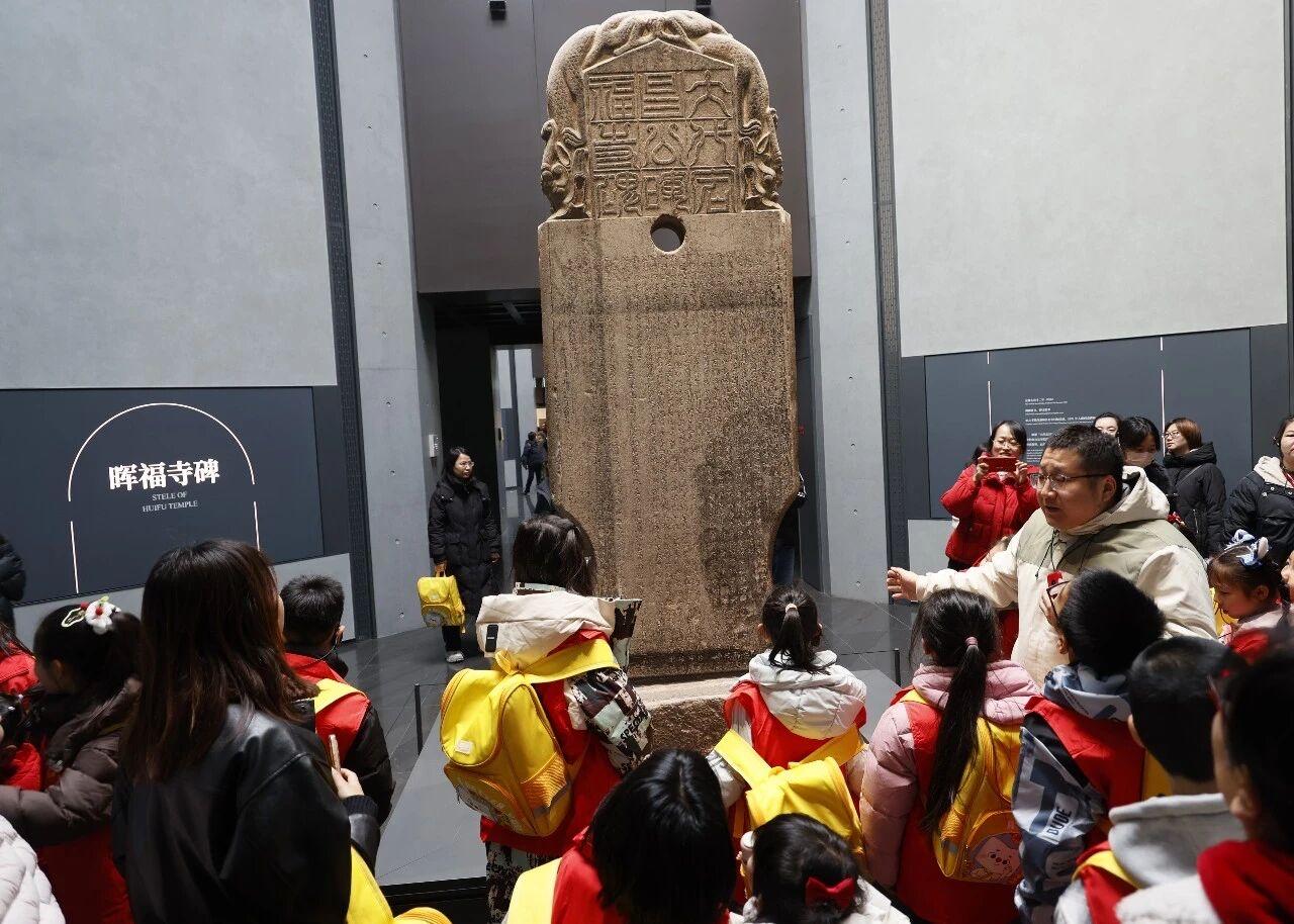 活动现场,“爱心妈妈”与孩子们一同走进西安碑林博物馆开展沉浸式研学。讲解员以儿童视角讲述文物背后的历史,孩子们触摸碑石、观赏器物,厚植家国情怀,坚定文化自信。