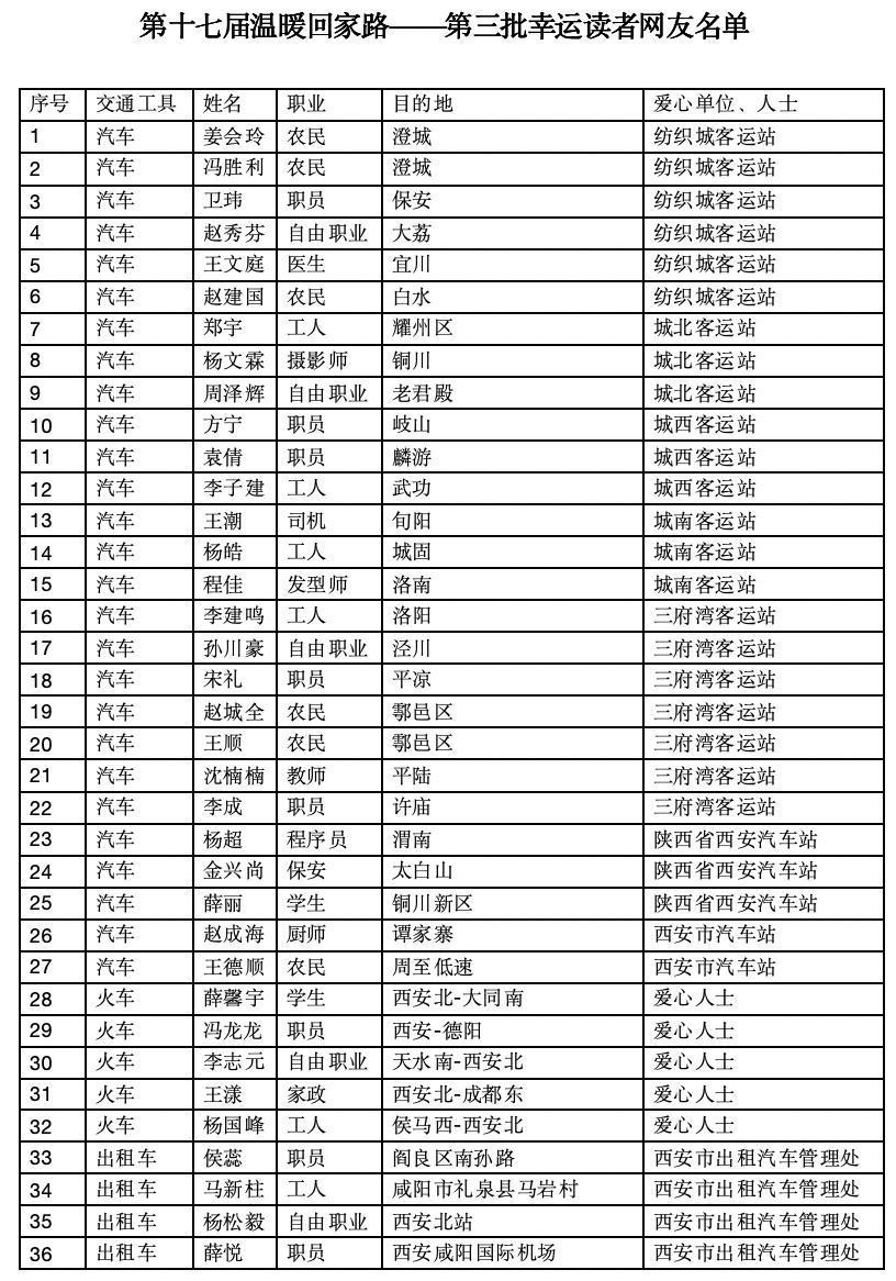 三秦都市报-三秦网讯(记者 陶颖 姬娜)2月2日起,三秦都市报全媒体联合陕西省交通运输工会,携手爱心单位和爱心人士启动“第十七届温暖回家路”活动,为返乡群众免费提供365张车票,并通过大家回家的行程、行囊、观念之变,看中国的时代发展和社会之变。2月5日,第三批幸运读者网友名单公布。
