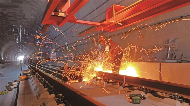 2月6日,西康高铁全线完成铺轨。图为最后一对钢轨在安康西站铺轨现场精准落位并完成焊接锁定。 本报记者 杨光摄