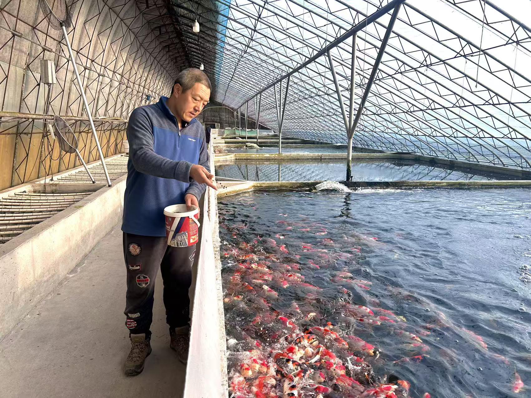 鲁家村观赏鱼养殖户杨义正在给鱼喂食。农民日报全媒体记者 刘云 摄