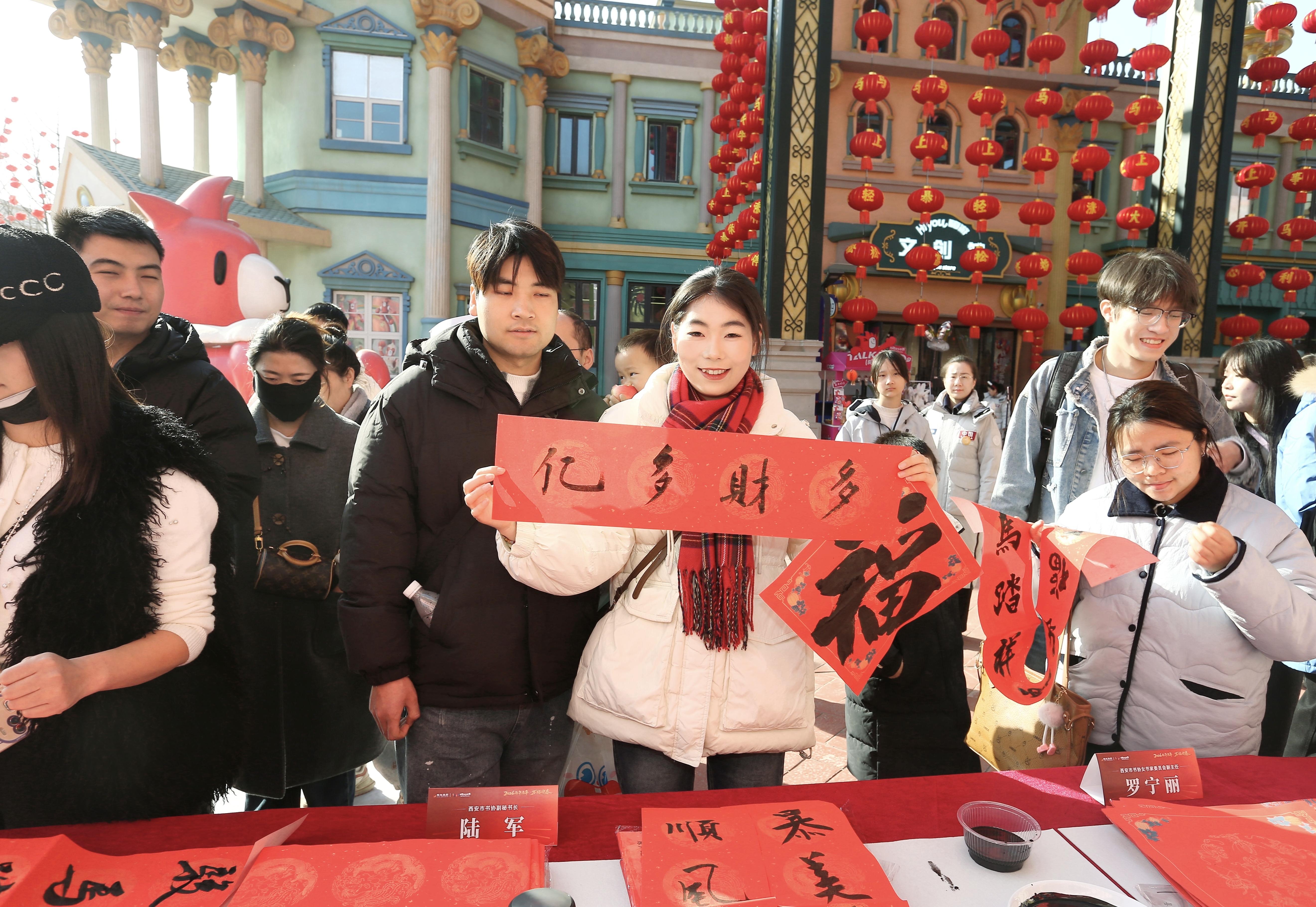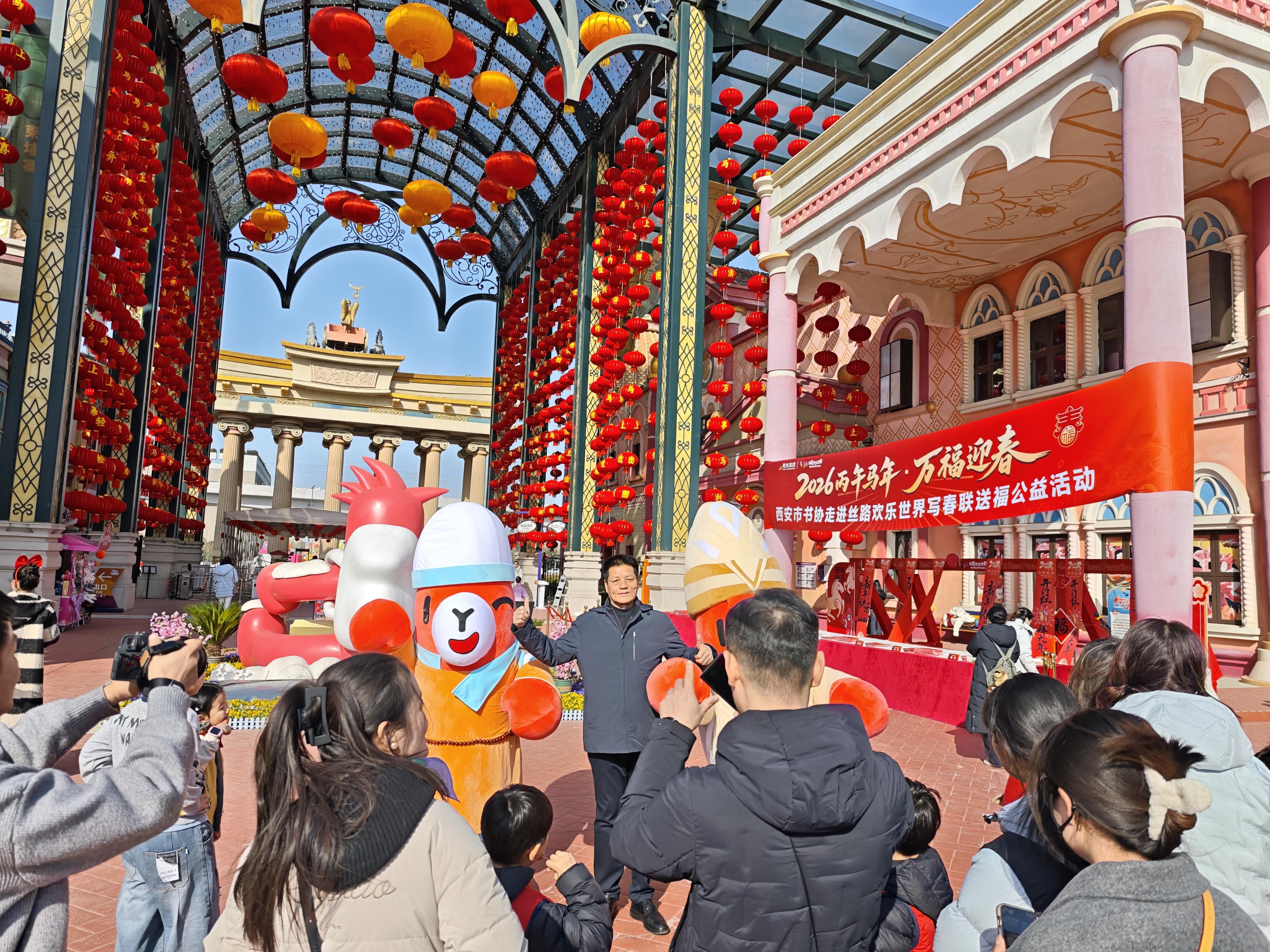 三秦都市报-三秦网讯(记者 余明)2月7日,由西安市书法家协会、陕西旅游协会书画分会主办,西咸新区丝路文旅商业管理有限公司承办的“西安市书协2026丙午马年‘万福迎春’公益活动”在丝路欢乐世界举行。本次活动以书法为载体、以新春为契机,通过现场写春联、送福字的形式,为游客送上传统文化与节庆温暖。