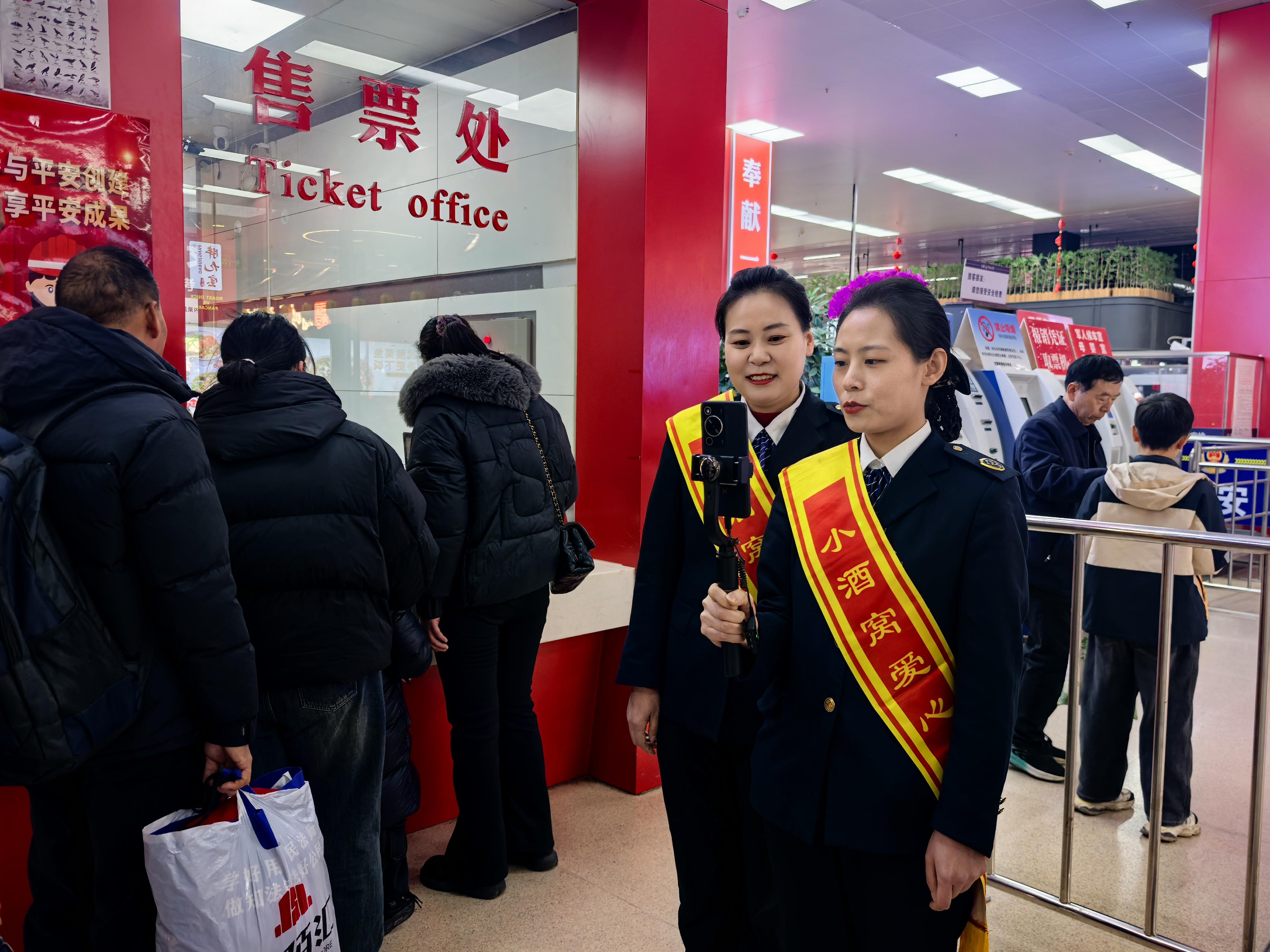 在自助购票区,身着红马甲的大学生志愿者耐心地协助老年旅客操作设备、完成购票。“春运期间,共青团西安市委专门为纺织城客运站招募了十余名青年志愿者!”直播间传来张蒙的声音,“他们与我们‘小酒窝’服务队员一起,帮助旅客购票、搬运行李、为老年人指路,让出行更加顺畅。”