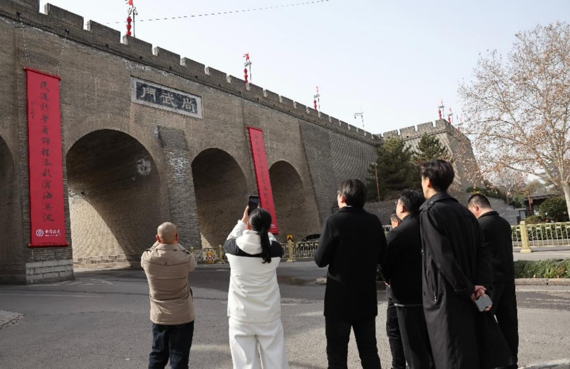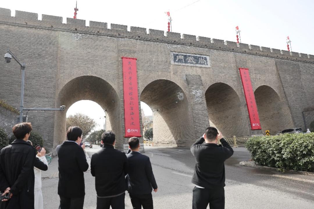 三秦都市报-三秦网讯(记者 陶颖 代泽均)“春动神州,正榆塞归鸿,柳营试马;民追新梦,看锦程添彩,沧海无波。”随着大红春联高悬西安城墙,千年古都瞬间被浓郁年味点亮。2月10日,专程来感受西安年的苏州游客陈先生和朋友李先生,在尚武门外久久驻足欣赏,被城门上气势恢宏、笔墨灵动的春联深深打动。