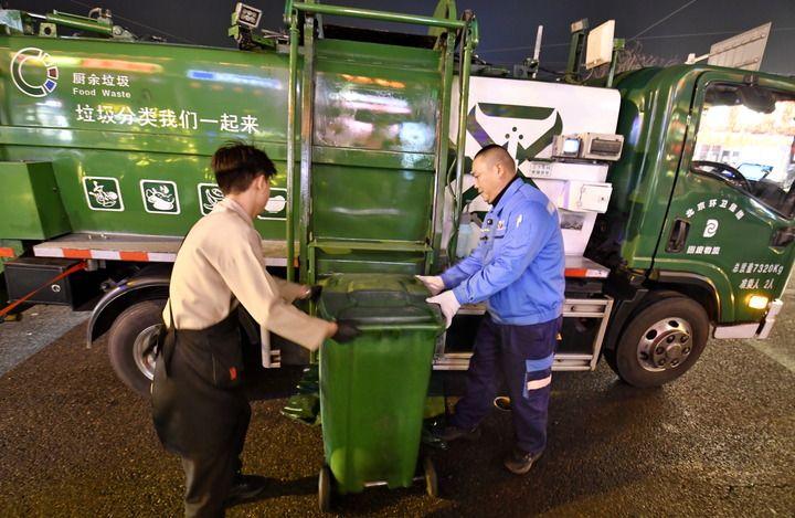 2月4日,北京环卫集团固废物流公司餐厨垃圾清运车司机李宁(右)在帮助饭店员工清运垃圾。新华每日电讯记者李欣 摄