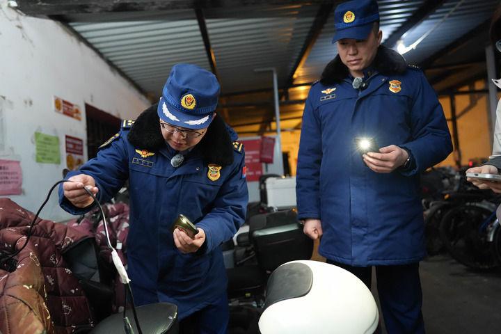 2月3日,消防站副站长王会军(左)和消防员贾超(右)在双榆树南里小区的电动车停车棚检查充电安全。新华每日电讯记者谢晗 摄