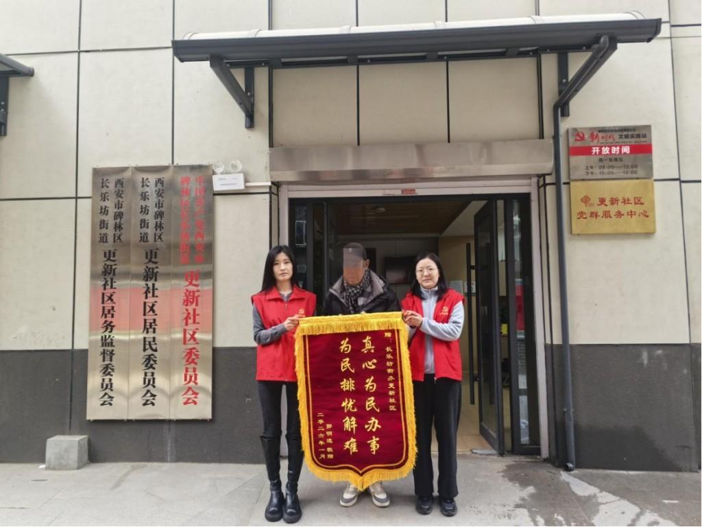 三秦都市报-三秦网讯(记者 姬娜 实习生 何依燃)2月9日,西安市碑林区长乐坊街道更新社区迎来一位特殊访客——社区低保户郭先生手捧一面绣着“真心为民办事 为民排忧解难”的锦旗,郑重交到社区工作人员手中,感谢社区在其家庭最困难时期给予的精准帮扶与暖心关怀。