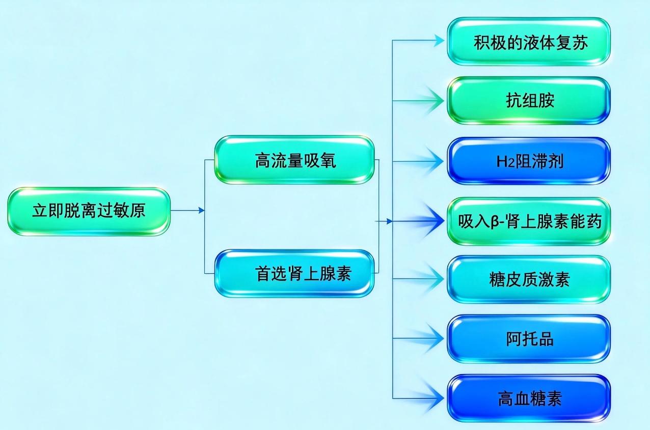 辅助药物治疗:包括抗组胺药(如苯海拉明)、糖皮质激素(如氢化可的松)和支气管扩张剂(如沙丁胺醇)。