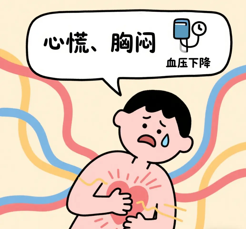 3. 心血管症状:胸痛、心悸、晕厥感、血压急剧下降;