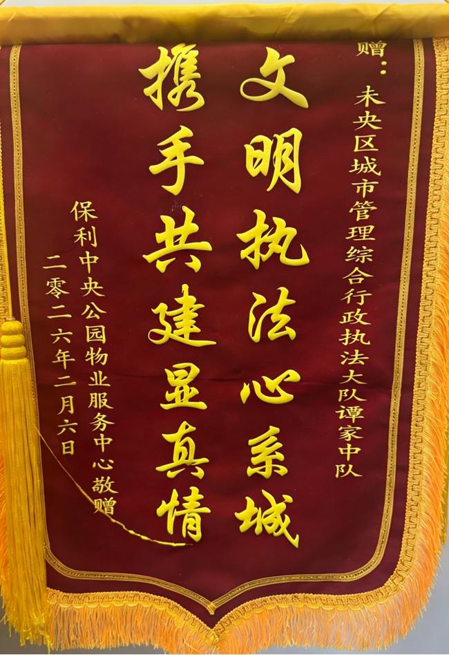 2月6日,恳谈会结束后,保利中央公园物业服务中心代表便专程送来一面印有“文明执法心系城 携手共建显真情”的锦旗。这面及时而至的锦旗,不仅是一份谢意,更是对“共建共治共享”从会议共识迅速转化为实践的直接认可。
